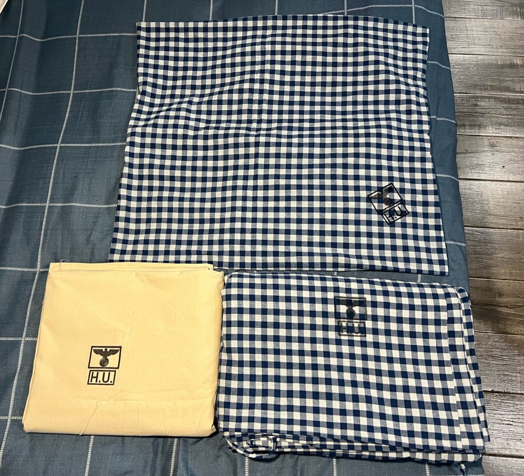 The bedding set includes one bed sheet, one quilt cover and one pillow case with HU Marking. Quilt Cover and pillow case are made of 100% plain weave cotton checker material. The bed sheet is unused military surplus from the 80s and will accommodate up to a Full size bed.